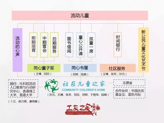 北京工友之家-社区儿童之家: 属于北京工友之家文化发展中心(2002年正式注册的非营利性社会公益服务机构),成立于2007年,立足社区、服务社区,致力于改善流动儿童的生存和教育状况,推动平民青少年儿童可持续发展,联合社会力量,构建青少年儿童成长的社会支持体系,促进教育公平。2015年创立“同心童子军”和“同心书屋”,辅助平民青少年日常的学校教育,以“野蛮其体魄、文明其精神”。2016年,开启市区“周末自然教育”计划,探索社会企业模式,以便可持续、深入地推广流动儿童教育项目。